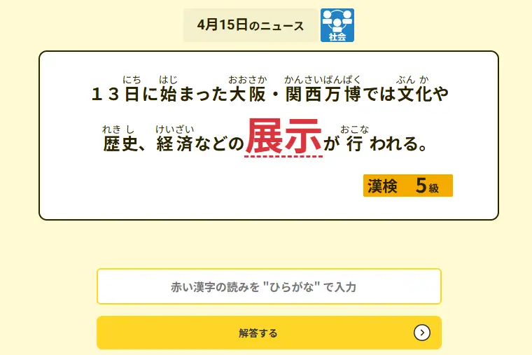 公益財団法人 日本漢字能力検定協会(本部:京都市東山区/代表理事:山崎信夫/以下、当協会)は、株式会社朝日学生新聞社(本部:東京都中央区/代表取締役社長:安田雅信)が発行する「朝日小学生新聞」と、漢字問題にチャレンジしながらニュースのおさらいができるワークシート「ニュースで漢字ドリル」を共同で制作しています。2025年4月から2026年3月まで、毎週金曜日に朝日小学生新聞のホームページ上で配信中です。